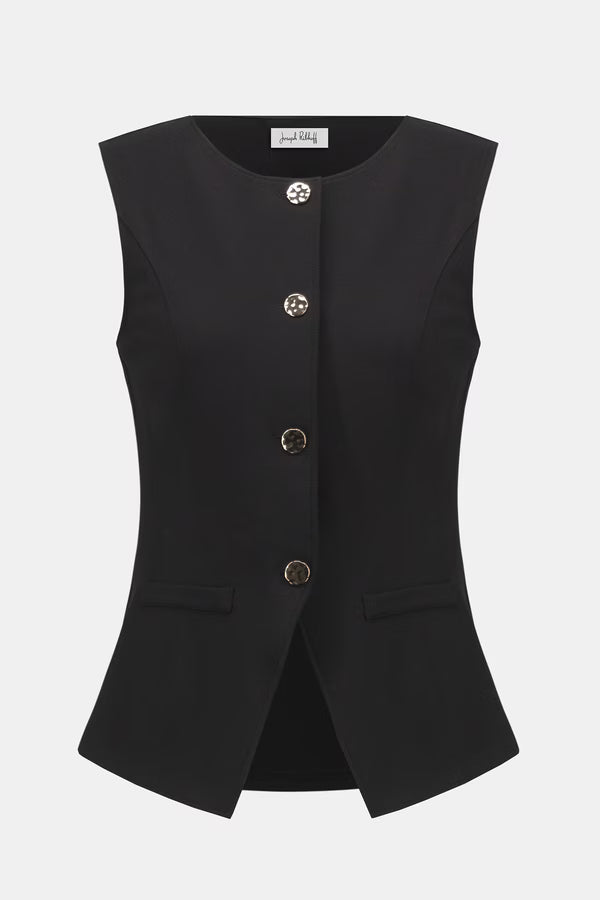 Elevate your style with this chic heavy knit vest. The sleeveless fitted silhouette gives character and poise to any ensemble. Cutaway details at hem and decorative princess line buttons adorn the garment, adding to its remarkable polished look.