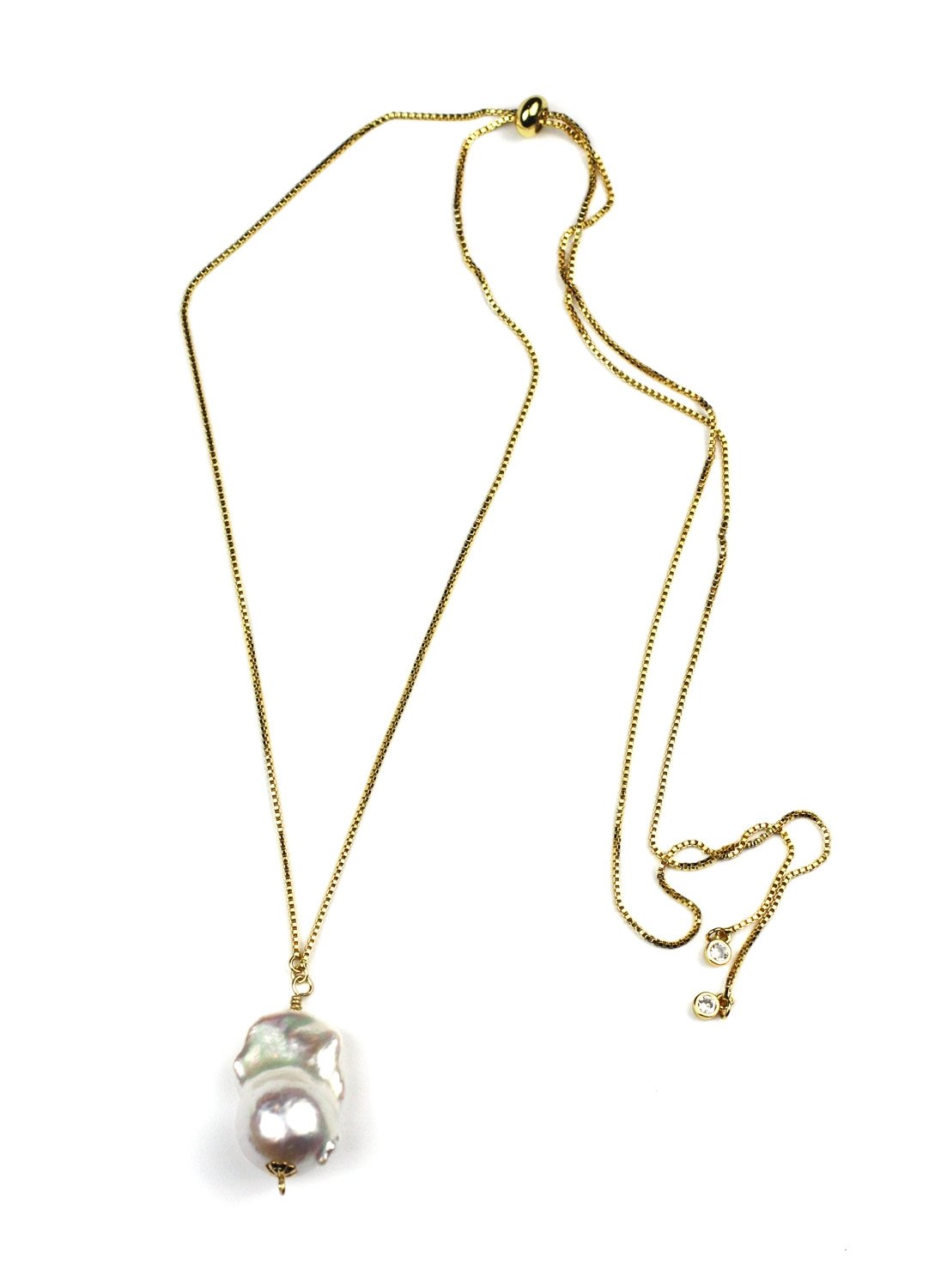 This fun simple necklace is perfect for everyone. It features a unique baroque pearl on an adjustable chain. Wear it everyday on it’s own or layered with other necklaces. The necklace adjusts from a choker down to 28 inches.