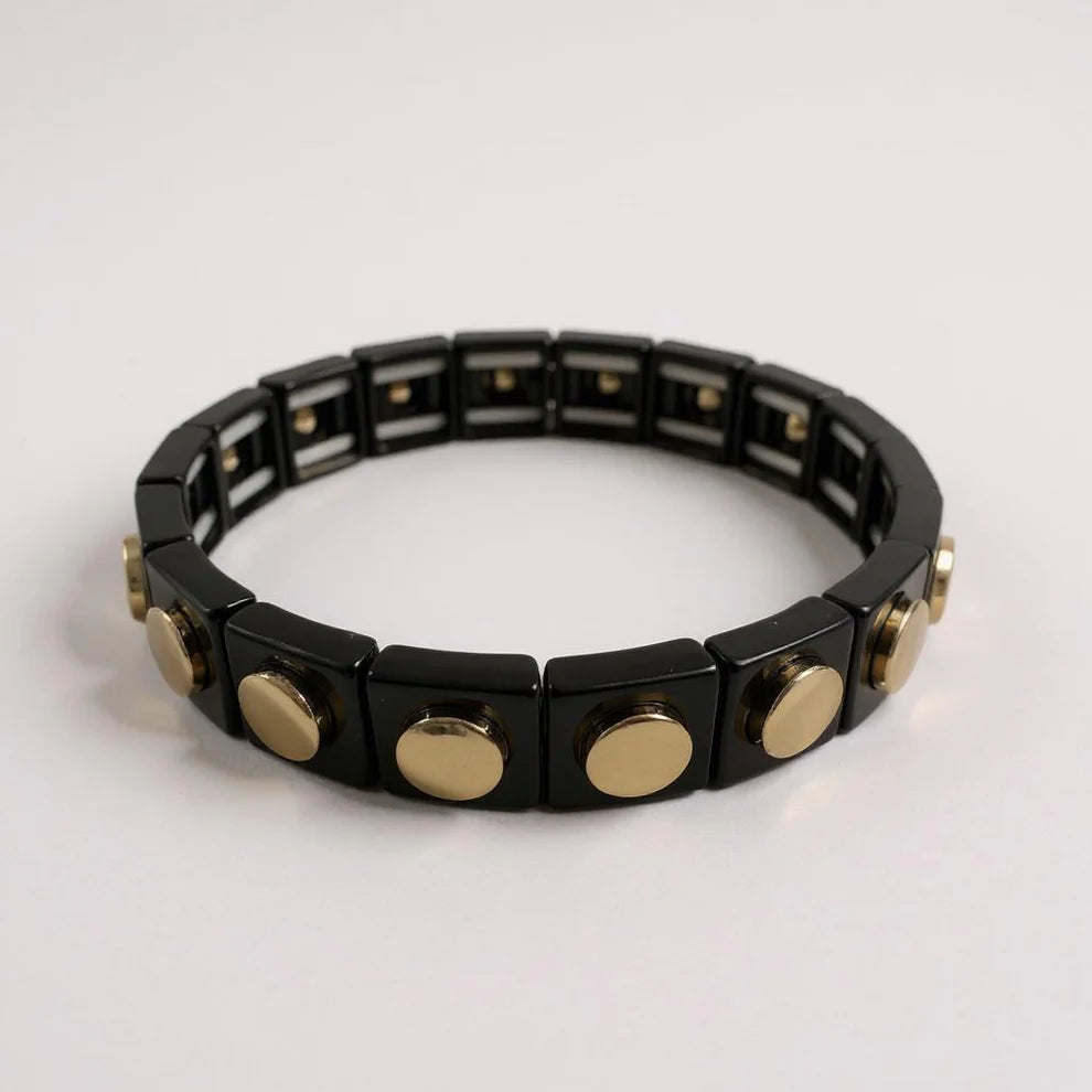 Enamel coated stretch bracelet with 14K gold plated stud detail.