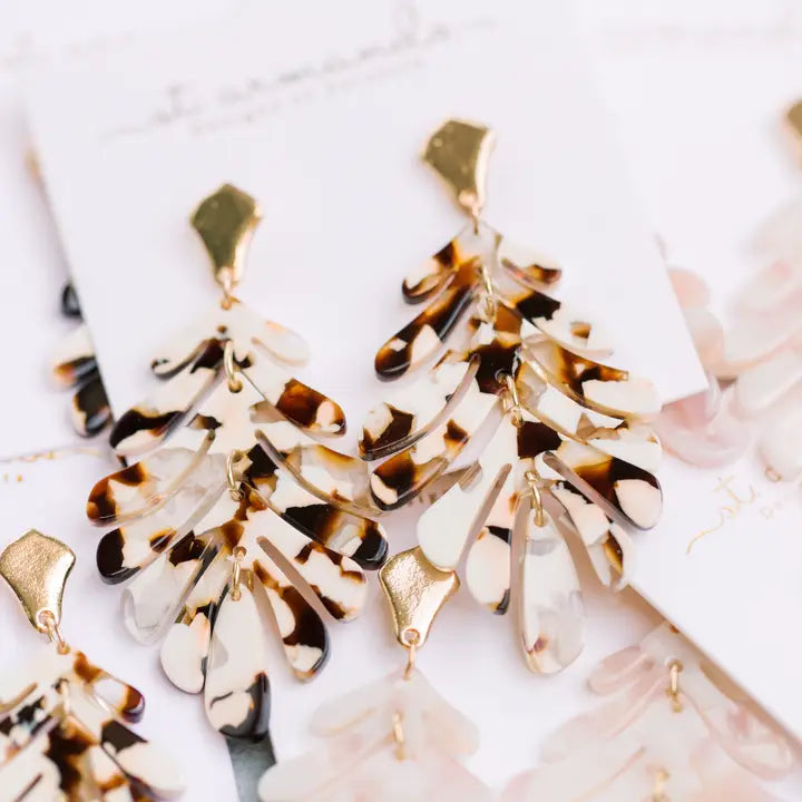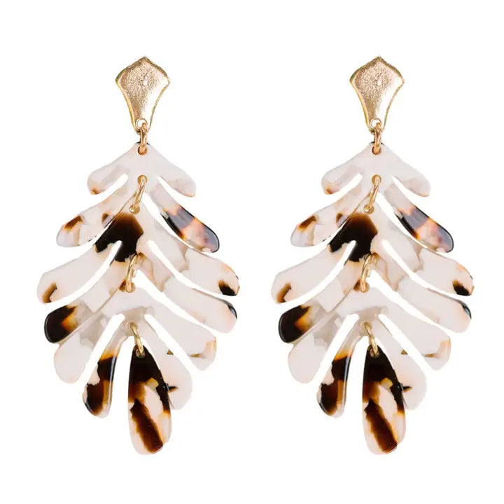 New Palm Earrings are in for spring/summer 2021 and are made of the same lightweight materials as our best-selling tortoise collection. We love pairing them with a tan open knit sweater and white jeans for a casual waterfront dinner. Palm Tree Leaf / Monstera Leaf Earrings 2 Inch Drop Post Back Weightless Design