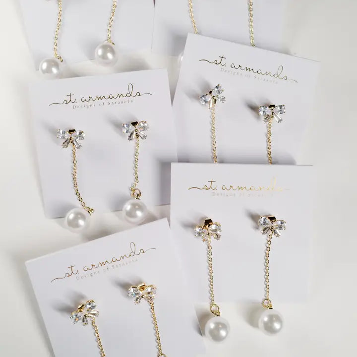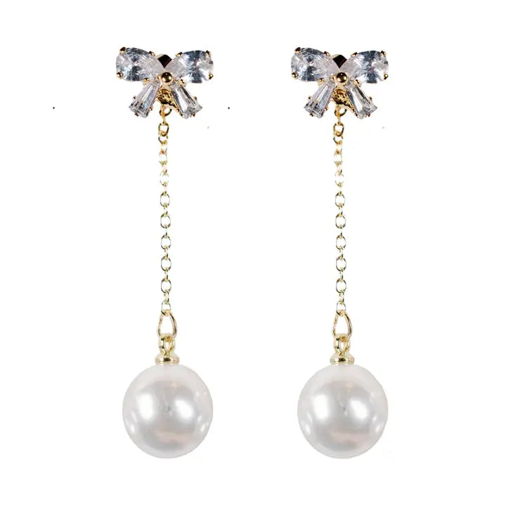 Sweet, sparkling, and perfect for the holidays—these earrings feature a delicate crystal bow stud paired with a dainty chain and faux pearl drop. Lightweight and full of charm, they’re ideal Christmas statement earrings for gifting, parties, or adding a playful-glam touch to any festive outfit.