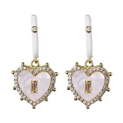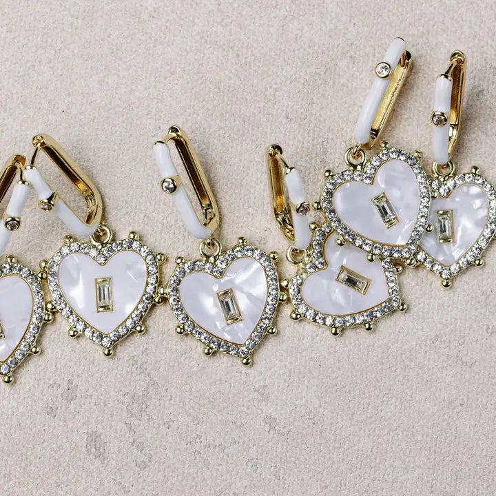 Inspired by the beautiful ceramics and fine marble of the Amalfi Coast, we are excited to add a new heart motif to our best-selling Capri Charm Earrings Collection - just in time for Valentines Day! These fun 2-inch long heart earrings feature a white faux mother of pearl heart paired with a white enamel and faux diamond finding, creating a sleek monochromatic look with just the right amount of Valentine’s Day Sparkle!