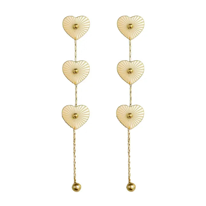 Add a sleek and modern touch to your everyday wardrobe with these easy and on-trend gold plated stainless steel earrings. Featuring three delicate heart charms that swing and sparkle with every movement, these weightless earrings are the perfect easy, seasonless update to pair with both neutrals and prints. Best of all, the 3.5” duster style is basically weightless! This collection is available in a heart, clover and daisy motifs.