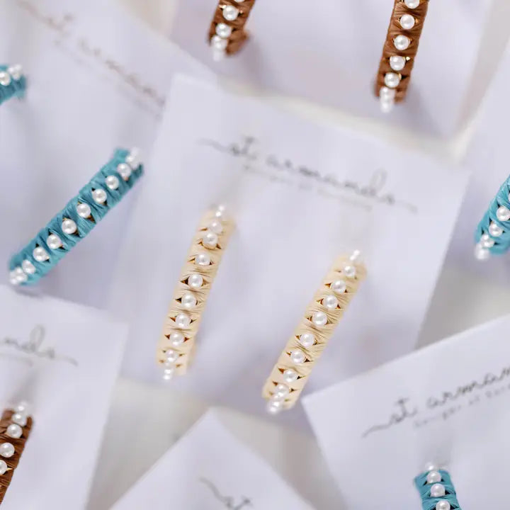 Classic, lightweight 1” hoops featuring studded pearls are wrapped in strands of raffia and capped in gold, adding a touch of organic texture and sophistication to any outfit.