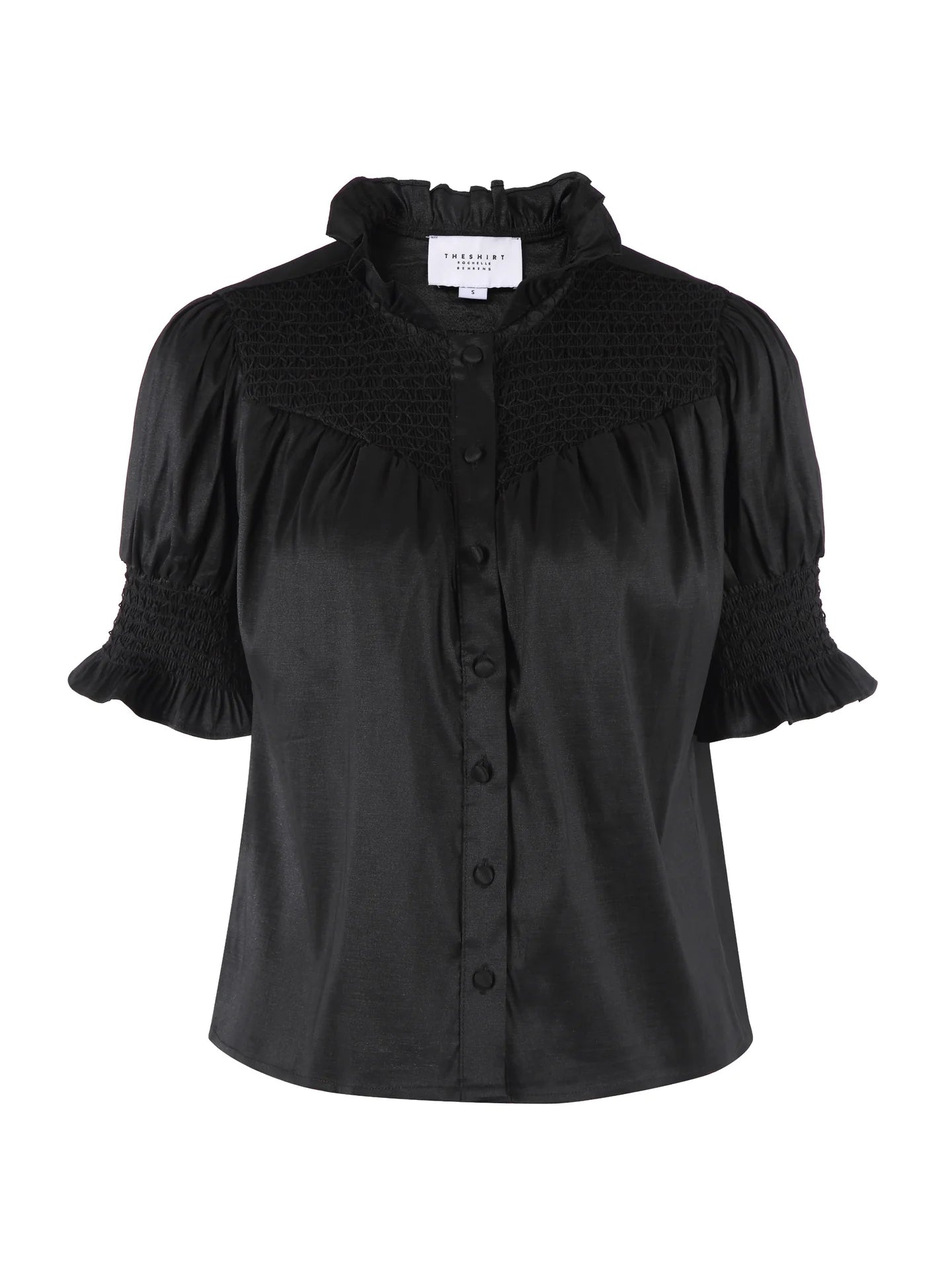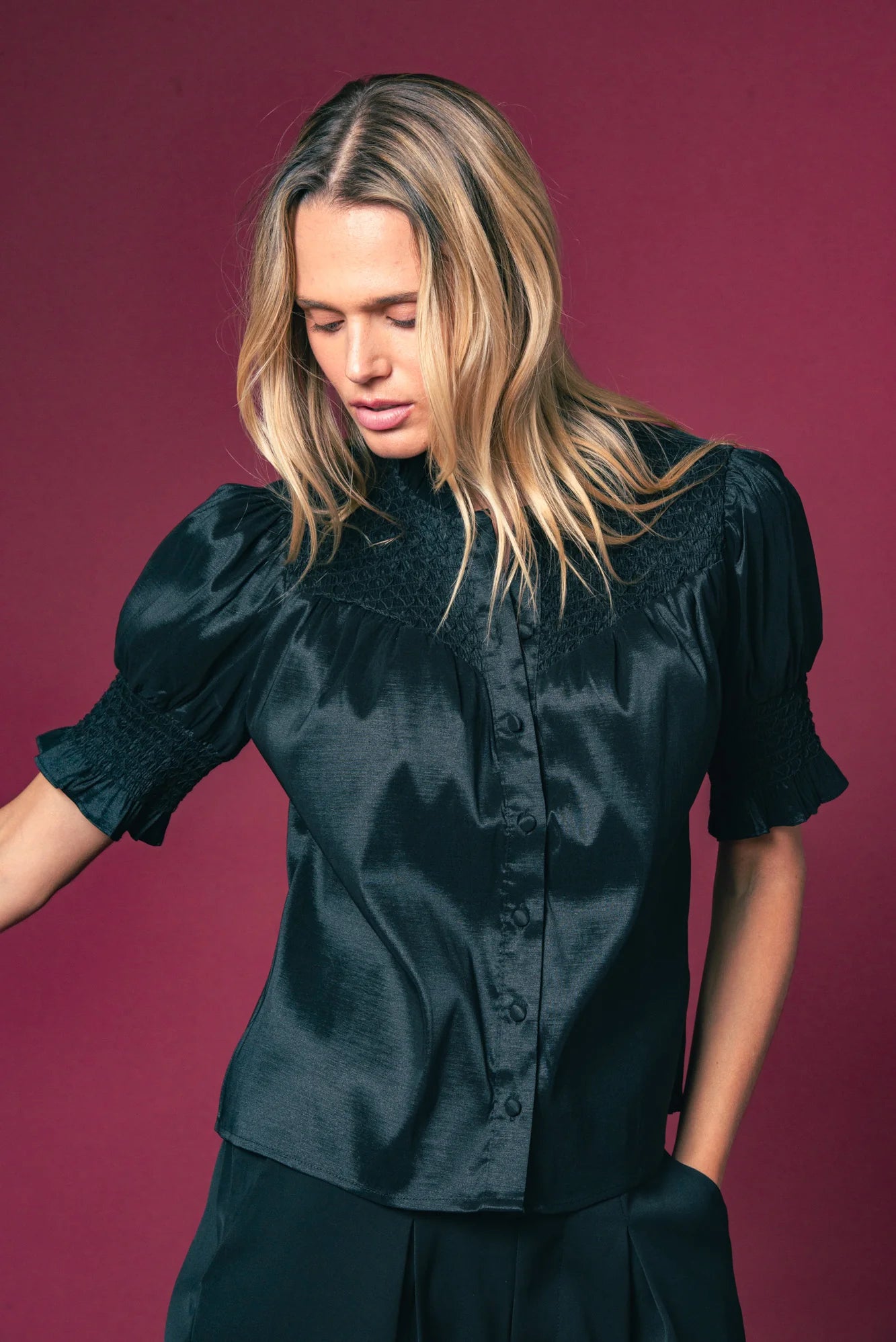 With a smocked top and contrasting stitching, a cropped shape and covered buttons, this is the sweetest top you’ll wear all season.