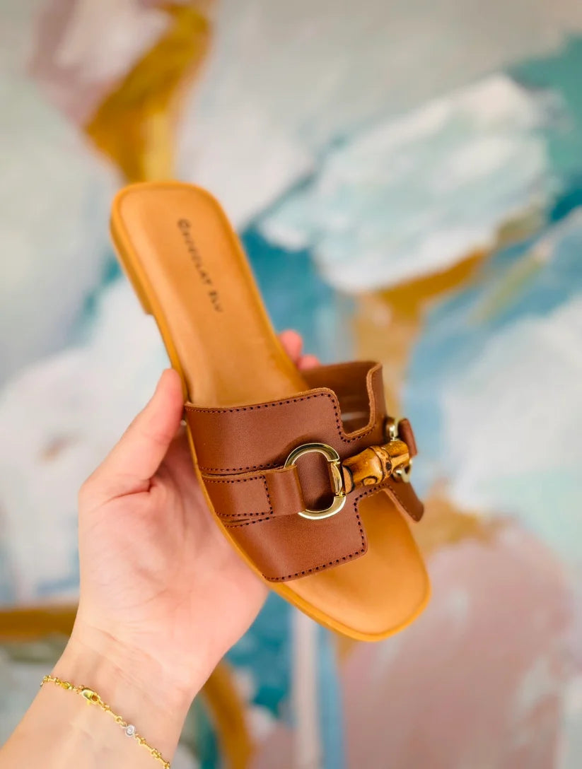 Cushioned brown leather slip on sandal with bamboo buckle detail.