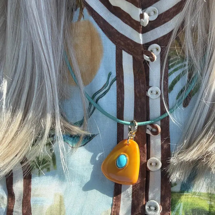 An orange seashell pendant accented with a turquoise stone on an adjustable 26” turquoise cord. A vibrant piece that adds a sun-kissed touch to any look.