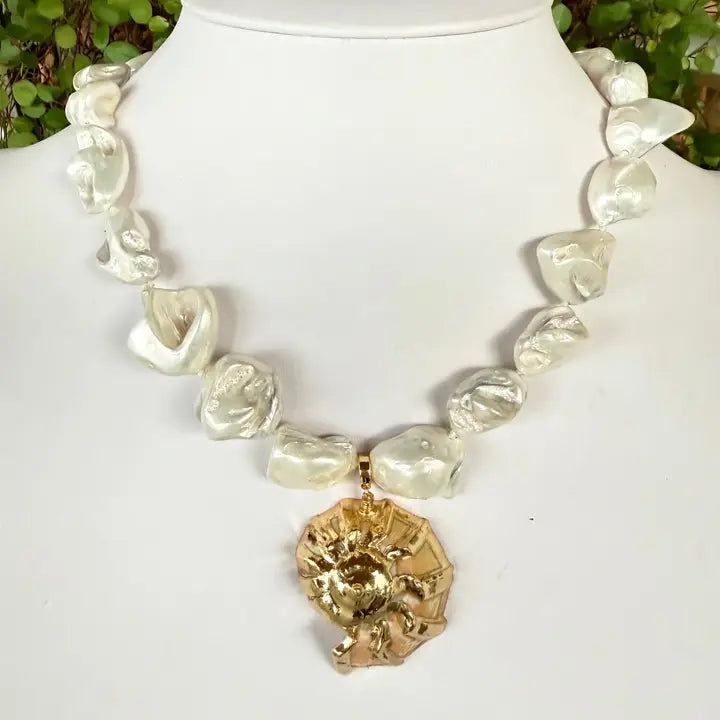 Gold embellished shell pendant on hand knotted fresh water pearls  -18"