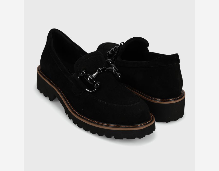 Suede lug sole loafer. Metal bit keeper. Ultra-padded removable insole. Stitched welt. 1.5 inch heel. Rubber sole.
