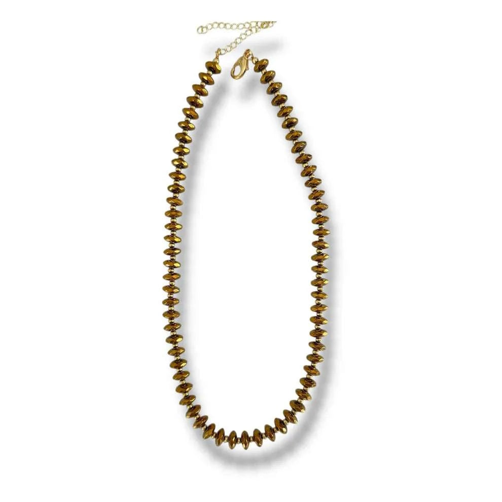 16" beaded necklace with 3" extender. Hematite rounded beads and clasp closure.