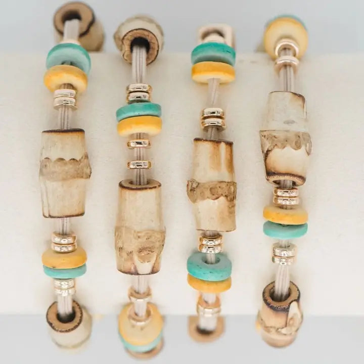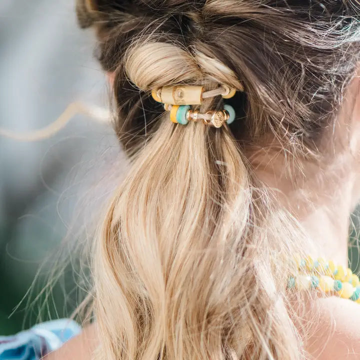Set of 4 hair tie bracelets featuring bamboo-detailed beads in turquoise and yellow. Designed to be worn in your hair or on your wrist, they add a relaxed tropical touch while keeping a go-to hair tie within reach.