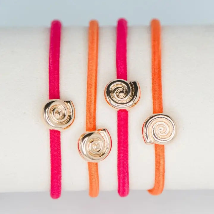 A set of 4 hair tie bracelets with conch shell accents in hot pink and orange tones. Equal parts functional and stylish, they transition seamlessly from wrist stack to hair accessory.
