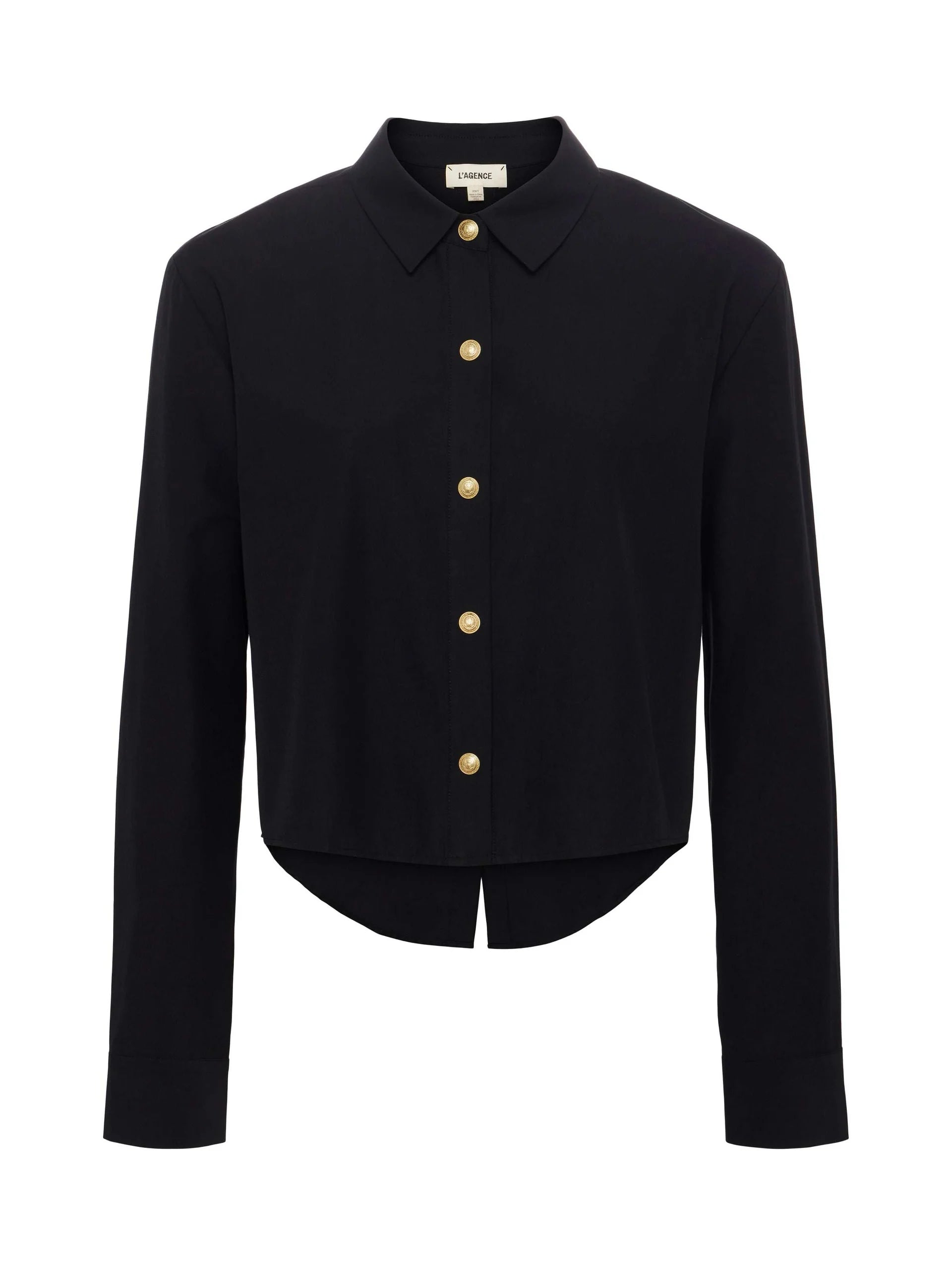 A classic tailored shirt with a cool, borrowed-from-the-boys fit and miniature embossed dome buttons for a touch of glamour. Now in black and gold.