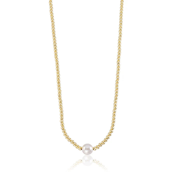 Handmade in Brazil. The shiny, tiny gold balls on this necklace ais highlighted by a 10mm pearl at the center to accent the neckline. Coordinate with any ensemble from business, to casual to black tie!